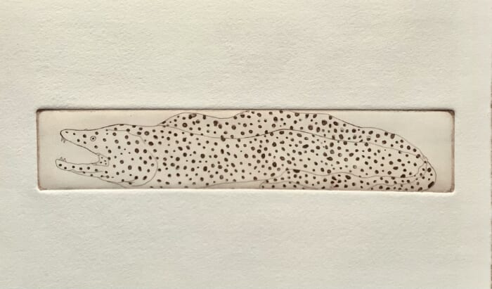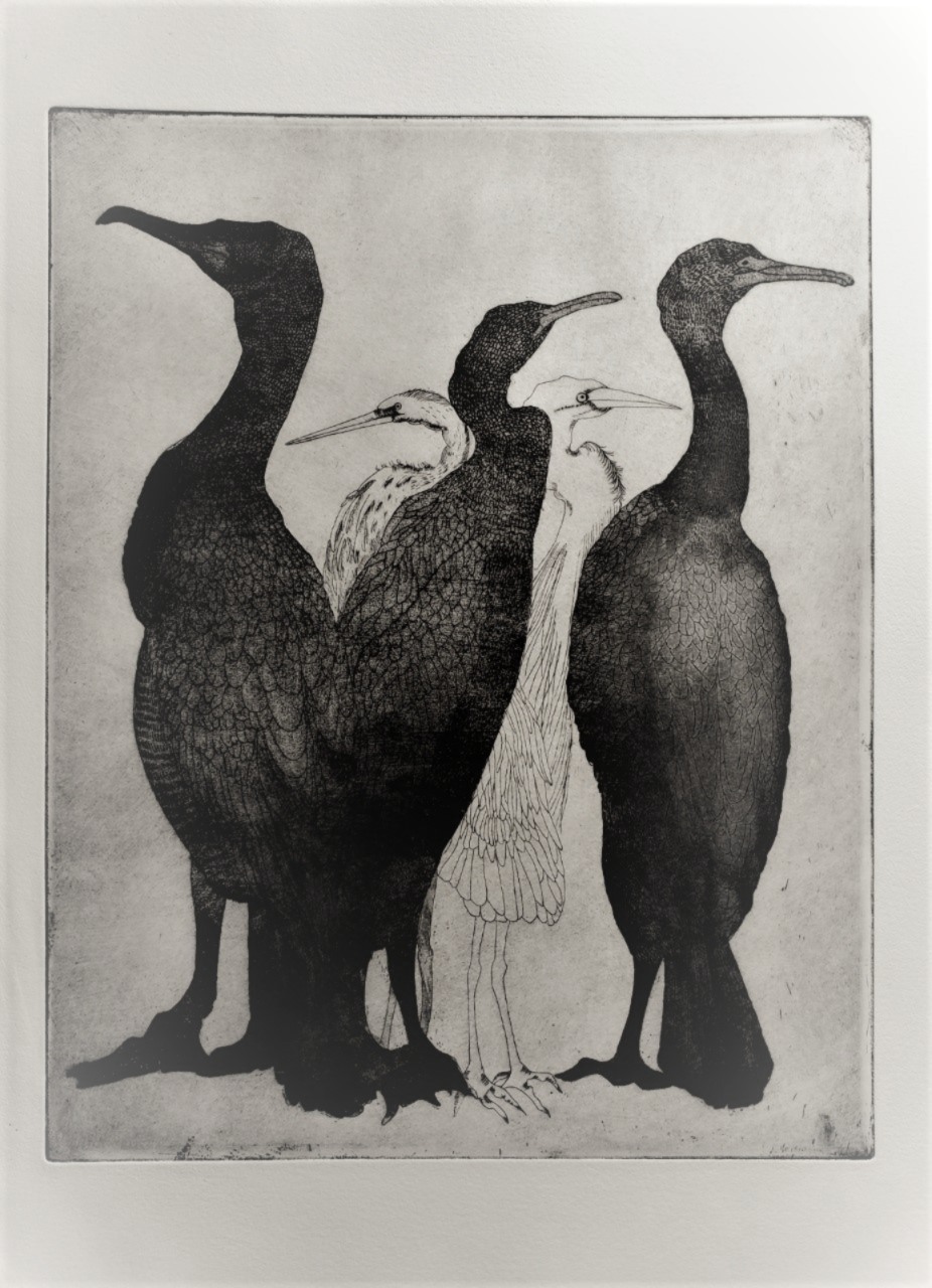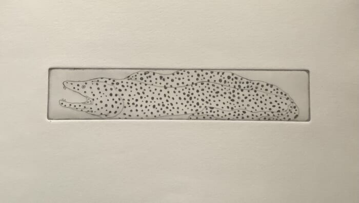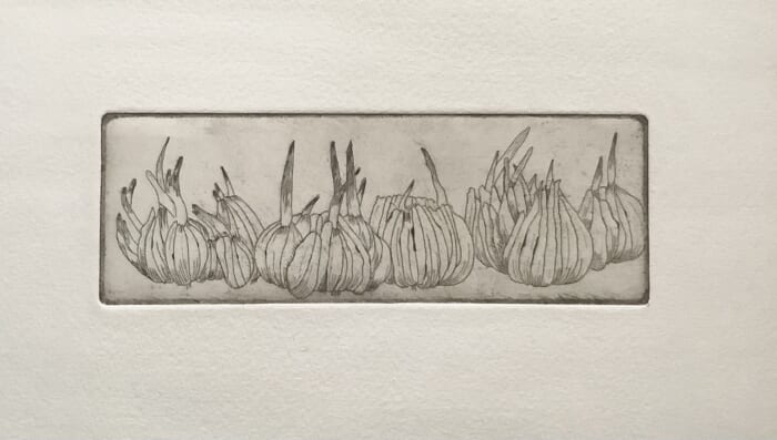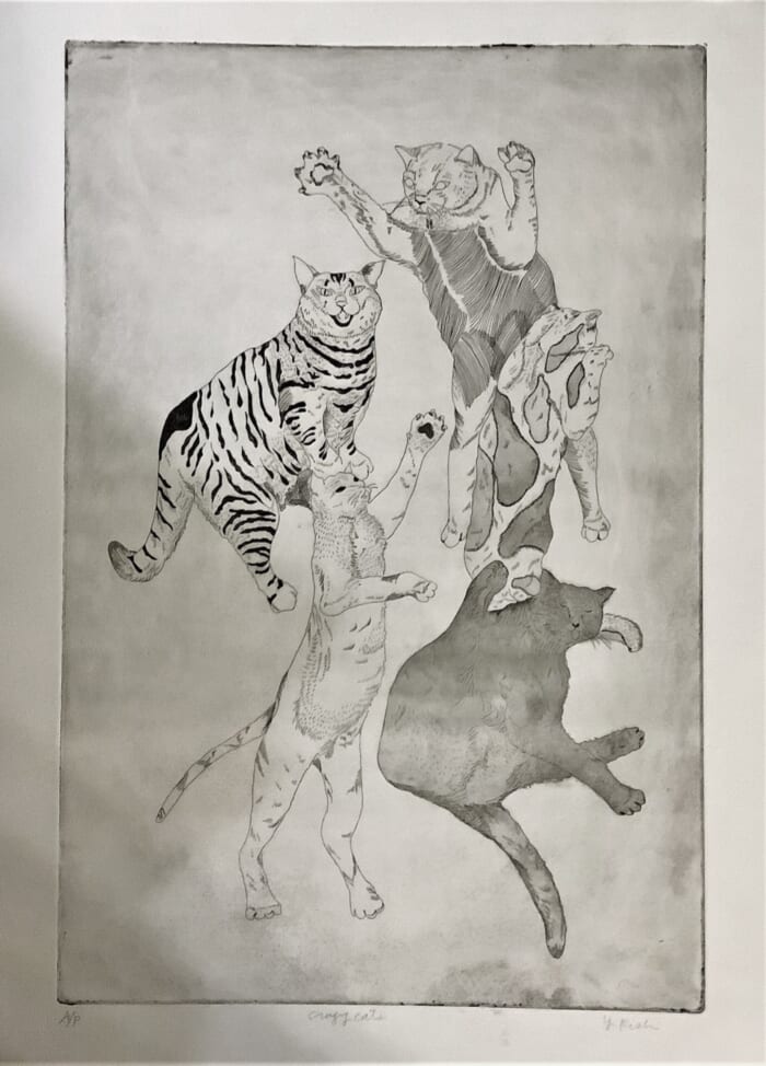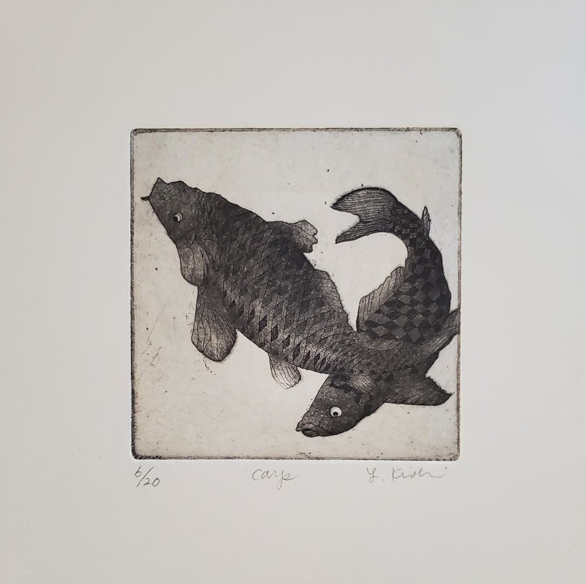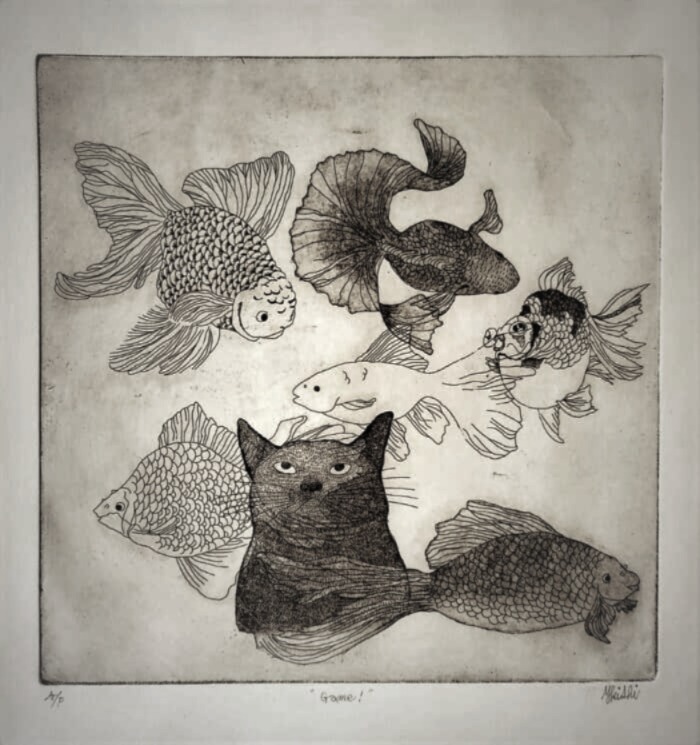 Gallery ご挨拶こんにちは。銅版画をやっている岸と申します。これまで10年以上作品を作り続け、個展やコンペティションに参加しましたが、日の目を見ない作品も多く、SNSや口コミで閲覧、購入してくださる方もいらっしゃるので、それならば、とお披露目の場として、また、自分自身のモチベーションの維持のために、このHP作成に至りました。Webギャラリーとして、お楽しみ下さい。 Garlic ニンニクを一つ。5cmx5cm Paprica パプリカブラウンのインクで作成。ガーリック、パプリカなど、身近なテーマも楽しい作品になります。5cmx4cm Bulbs 球根芽が出てしまったニンニクも愛嬌があります。5cmx15cm Storm 嵐6cmx6cm Moray eel ウツボ4.5cmx22cm Moray eel ウツボレンガ色のインクで刷ってみました4.5cmx22cm Cool cats カッコいい猫たちちょっと悪猫たちの躍動感ある表情も素敵ですね。 Cormorants, Herons 鵜と鷺Size 40cmx30cm Cormorant 鵜Size 45cmx22cm Blanche 白猫Size 33cmx24cm Game Pilgrims 巡礼者たち Playfull じゃれてる子猫シルエットで表現した子猫。5cmx5cm Noir 子供の頃飼っていた猫。我が家に来て一週間後に子猫を3匹産んだ優しいお母さん猫。どこか寂しげだった。 Carp 二匹の鯉が自由に泳ぐ様子を10cmx10cmの銅板に閉じ込めました。CWAJ入選作品です。海外の方が気に入りたくさん購入してくださいました。 Line-Q NYの地下鉄で見かけた三人の男性。疲れて帰路に就く様子がNYの本当の姿に思います。スペイン・カダケスミニプリントコンテスト入賞作品です。