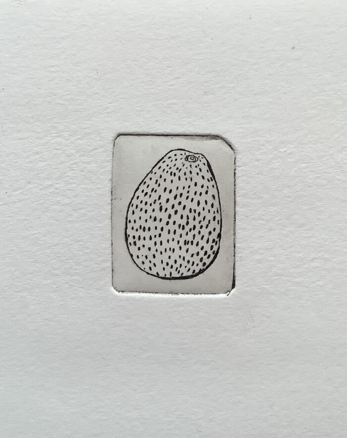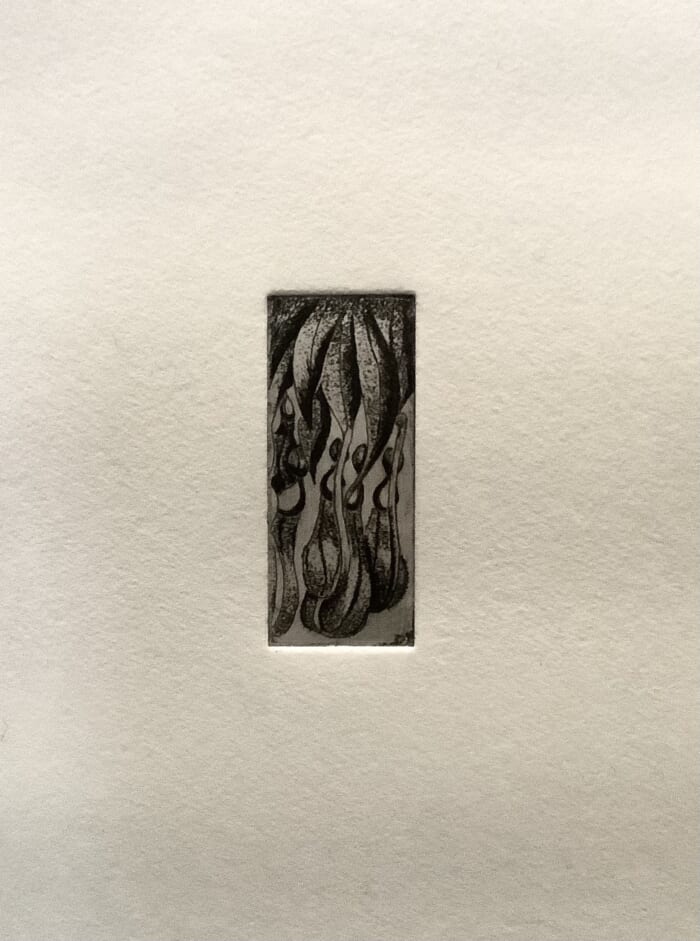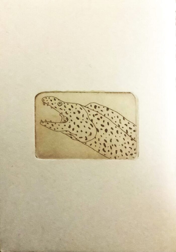 ウツボの頭をオレンジのインクとシンコレ技法で表現。小さい銅板ならではの、コミカルな作品に仕上がりました。