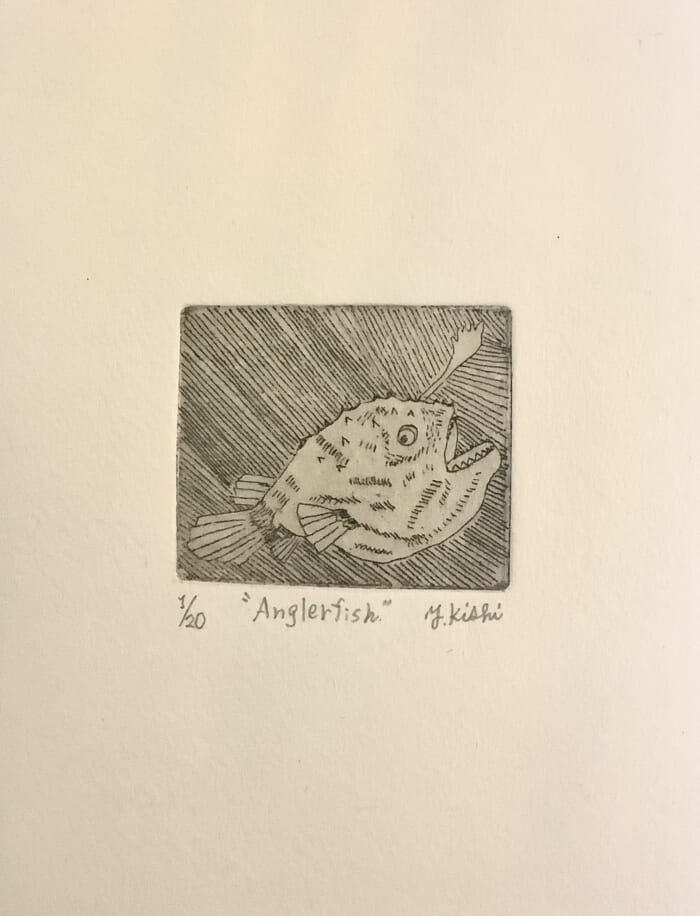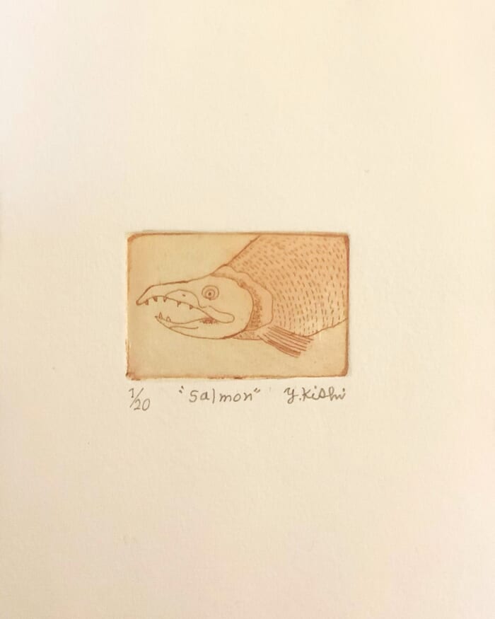 サケの頭。オレンジのインクでビビットに仕上げました。エッチングに”シンコレ”という薄い和紙を張り付ける技法を使い、印象をさらに奥深いものにした、小さいながらも手の込んだ作品です。